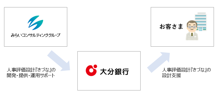 株式会社 大分銀行(頭取 高橋 靖英)は、お客さまの人事評価制度の設計を目的に、みらいコンサルティンググループ(代表 久保 光雄、岡田 烈司)と共同開発した「人事評価設計『きづな』」 (以下、『きづな』)のサービス提供を開始しますので、下記のとおりお知らせいたします。