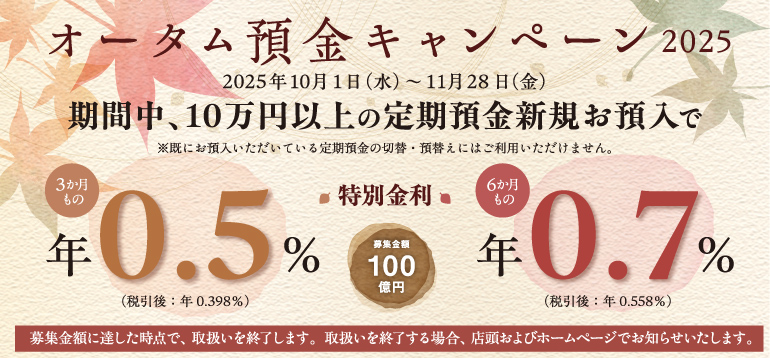 期間中、10万円以上の定期預金お預入で特別金利を適用します。