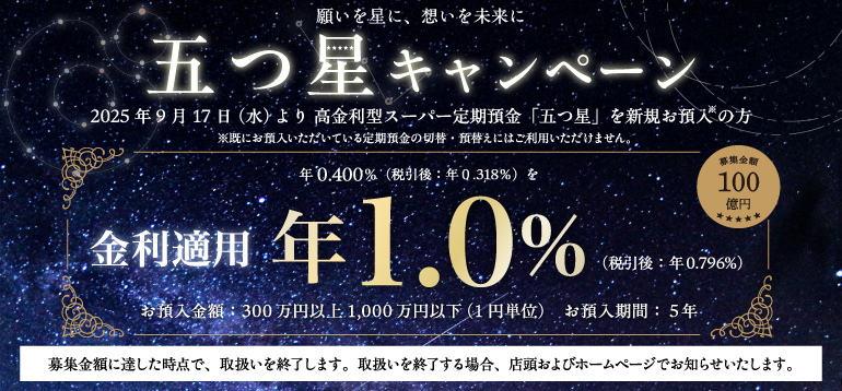 期間中にプレミアム定期預金「五つ星」をお預入された方に特別金利を適用します。