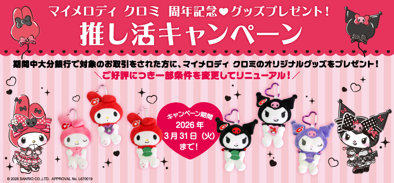 定期預金を一定額お預入れされたお客さまにマイメロディ・クロミのオリジナルグッズをプレゼント♪